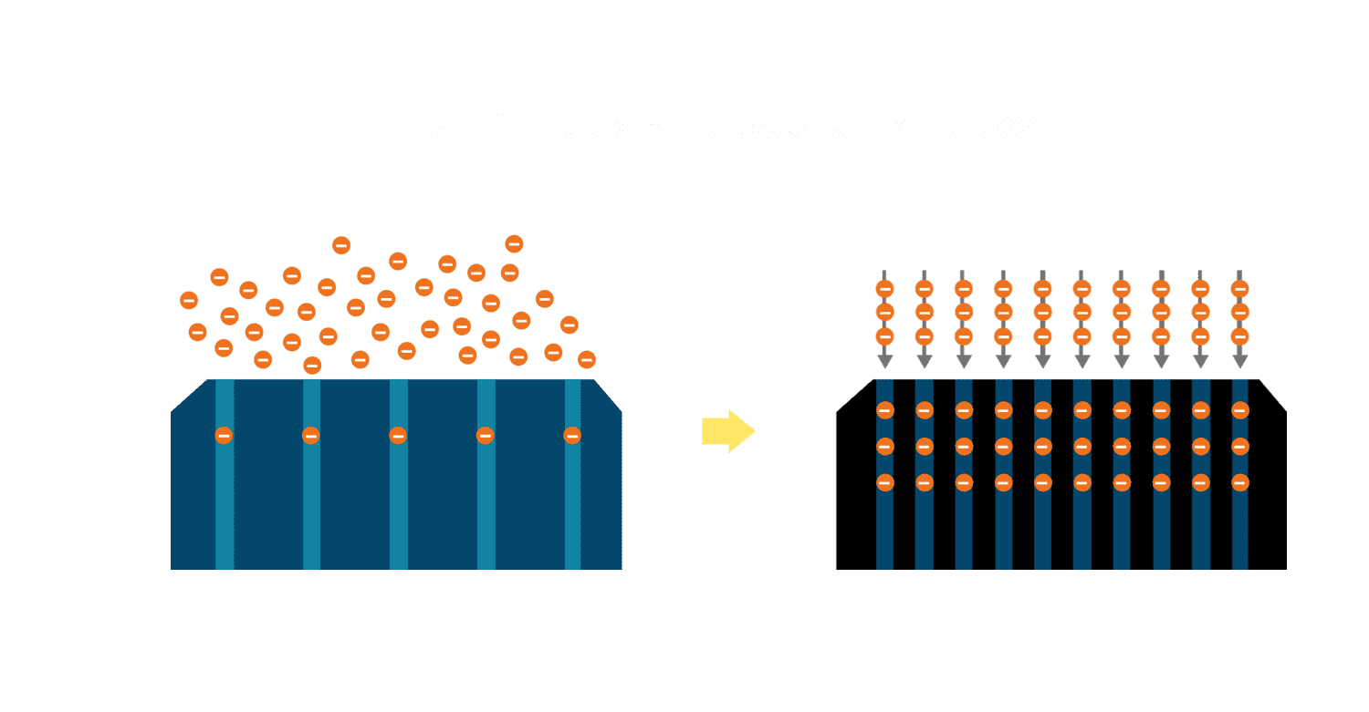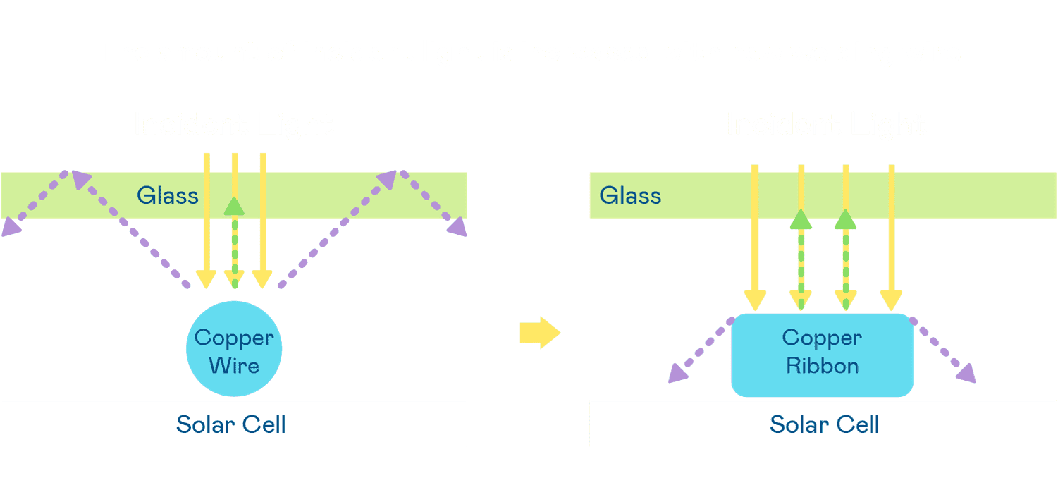 - 电池使用多条铜导线 (Copper wire) 于电池片上形成较短的电流路径,,,,提高电流收集效率,,采用圆形设计的铜导线较传统扁平式的铜焊带 (Ribbon),,,可增加入射至电池的光线量。。。