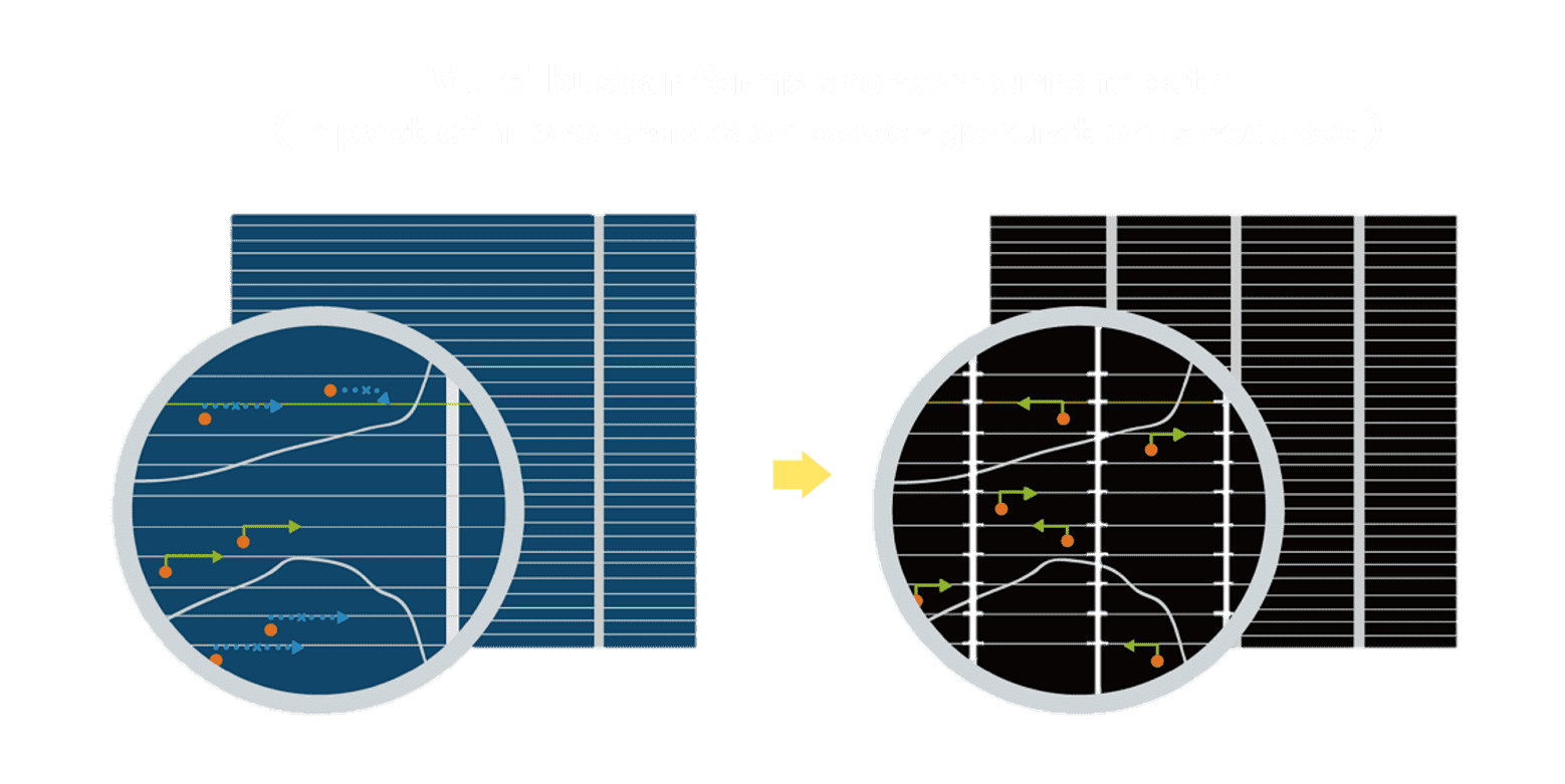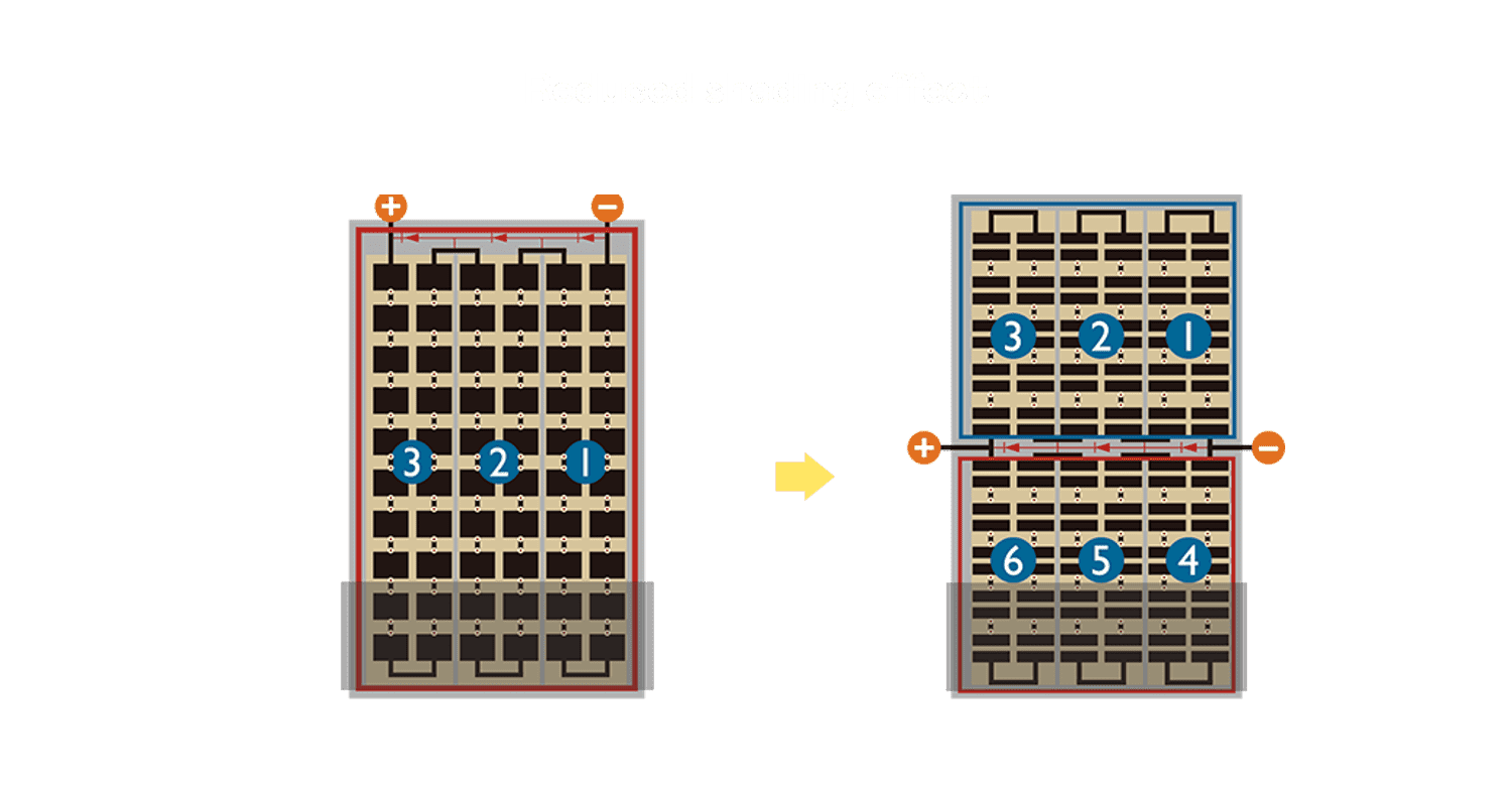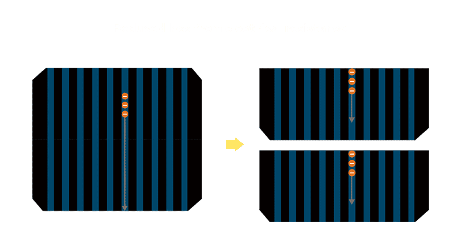 - 结合半切电池,,降低遮阴影响、、、、提升模组抗隐裂能力、、、、并减少电阻损耗,,,,进一步提升模组发电效能。。。